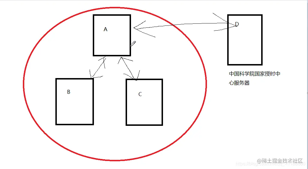 - NTP的全称是Network Time Protocol,也就是网络时间协议,常用于服务器中。它的原理很简单,例如下图,A、B、C服务器是我们自己的集群,集群中有一台主服务器A,需要与D的时间同步。