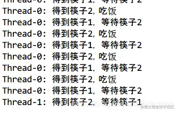 当线程一获得锁chopsticks1的锁定时,线程二也获得了锁chopsticks2的锁定。线程一执行完打印语句后,内层同步代码块想要获得锁chopsticks2的锁定,但是此时锁chopsticks2在线程二手中;另一边线程二执行完打印语句,内层同步代码块想要获得锁chopsticks1的锁定,但是锁chopsticks1在线程一手中。两条线程都因为无法获取需要的锁而进入了挂起状态,死锁由此诞生。