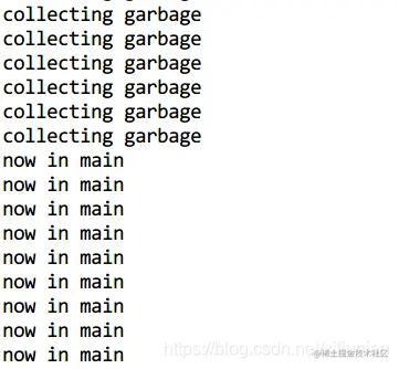 运行程序就可以在控制台中看到“now in main”和“collecting garbage”两种语句在控制台中交替打印。