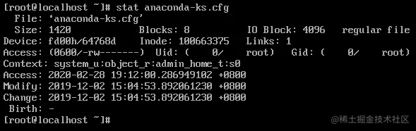 - regular file:文件类型(常规文件) ,如果是其他文件类型会显示出对应的文件类型