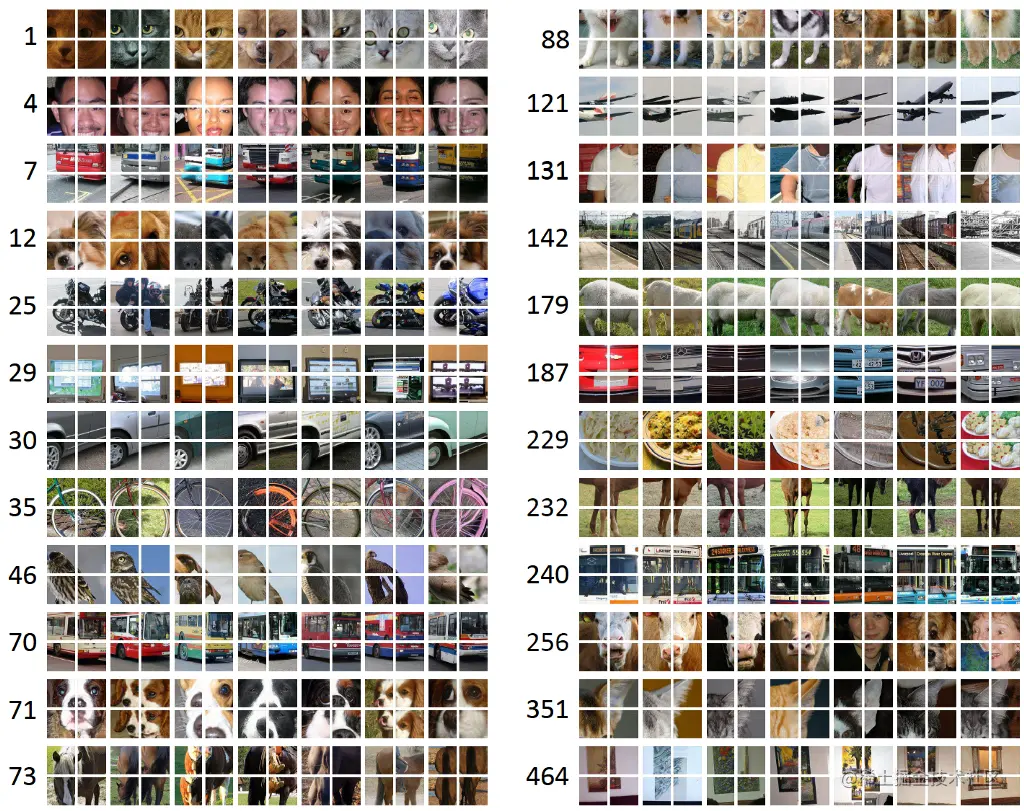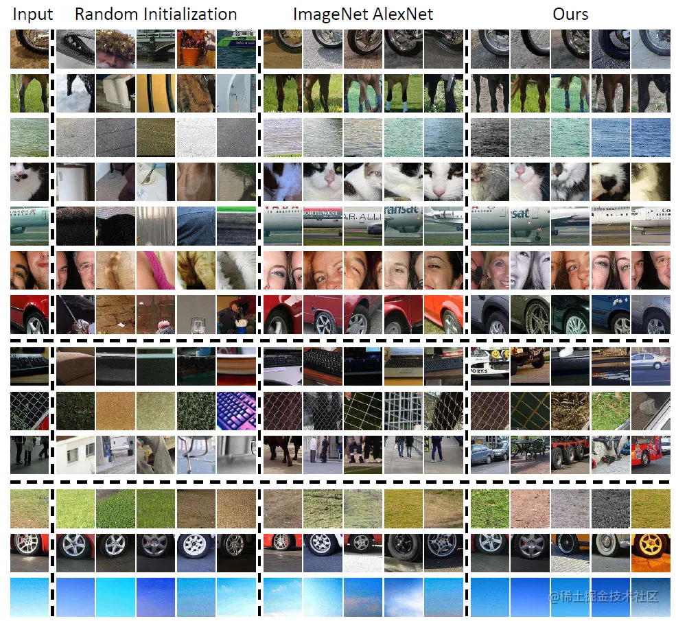 由最近的邻居获得的补丁集群的例子(fc6 特征来自我们架构的随机初始化 。 AlexNet在标记的ImageNet上训练后的 fc7 ,以及从提议的方法中学习的fc6 特征)