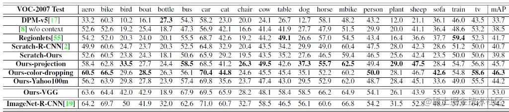 - Ours-Yahoo100m:使用了Yahoo/Flickr 1亿数据集[51]中随机选择的2M子集,该数据集是完全自动收集的。微调后的性能比Ours-projection/Ours-color-dropping稍差,但与从头开始的模型相比,仍有相当大的提升。