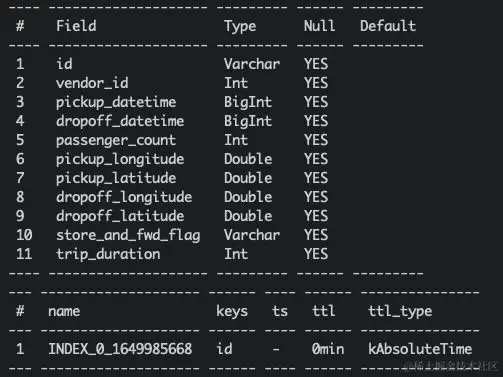 步骤1 | 启动 OpenMLDB 并创建表 使用 docker 或本地启动 OpenMLDB 集群,并创建表,作为 connector 导入的地址。如图所示,在 pulsar_test 数据库中,创建了 schema 和taxi trip demo 一致的表 connector_test。