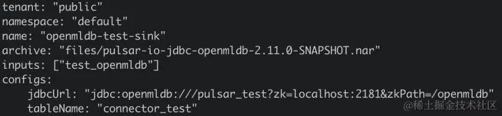 步骤2 | 启动 Pulsar,创建 sink 和 schema 启动 Pulsar Standalone 成功后,即可使用 connector 创建一个 sink,connector 如果预先装载进入 Pulsar,可以使用"jdbc-openmldb"的 sink type,或是使用"archive"指定 connector nar 文件路径。演示中使用后者来创建。创建sink的配置中还需指定 OpenMLDB 的表地址,所以配置情况如下: