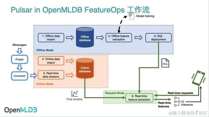 OpenMLDB Pulsar Connector,高效打通实时数据到特征工程,大幅提升数据使用效率、助力开发者构建实时数据管道、使企业更专注和更高效的探索数据的商业价值。 在 Pulsar in OpenMLDB 的工作流中,Connector(位置如下图所示)帮助开发者轻松地将消息系统 Pulsar 与开源机器学习数据库 OpenMLDB 结合使用,面向机器学习发挥出 Pulsar 最强大的实时价值。