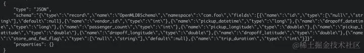 由于 OpenMLDB 表数据是有schema的,所以还需要在 pulsar 中为"test_openmldb"配置好 schema,才可以顺利将消息解析为符合O penMLDB schema 的数据并插入。 我们为"test_openmldb"配置 JSON Schema,各列和 OpenMLDB 的列属性一致。配置文件如下: