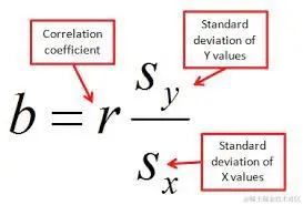 我们不会深入研究所有的斜率概念。但简而言之,r 是相关系数。Sy是Y值的标准差,Sx是 X 值的标准差。