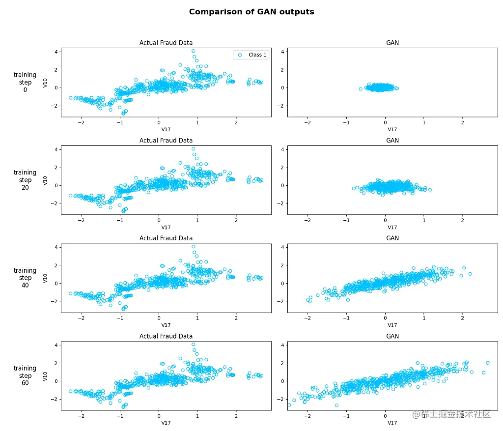 因此,我们看到V17和V10的值在我们的原始数据集中有一个模式("实际欺诈数据",左图),在训练和预测期间,GAN试图从中学习并尽可能地复制。在第60个历时结束时,V17和V10的最终值(以及其他特征)在一定程度上与原始数据集的值相似。