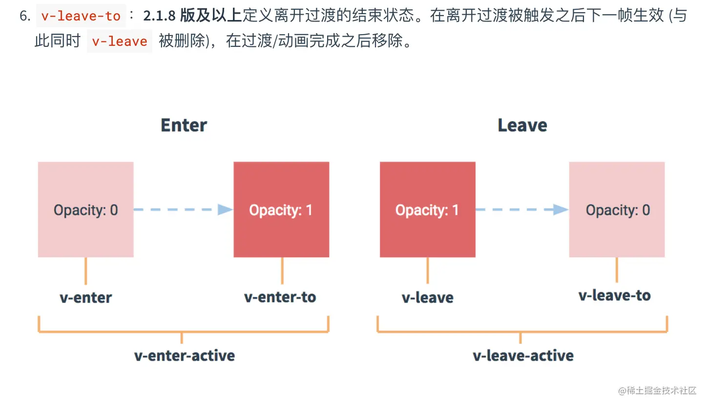 v-on:after-enter="afterEnter" // 动画结束,清理工作