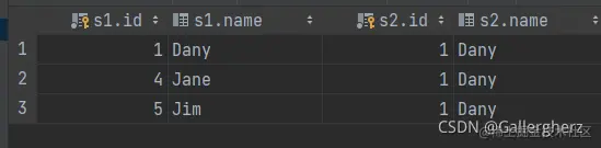 模仿一下执行过程,比如第一个是Dany,在第二个表中找和他dept_id相等的,显然找到三个,分别是Dany,Jane和Jim,然后判断有没有表二的id还是等于一的,一看还真有,于是我们把表一的Dany打印出来。同理模仿下面的查找。