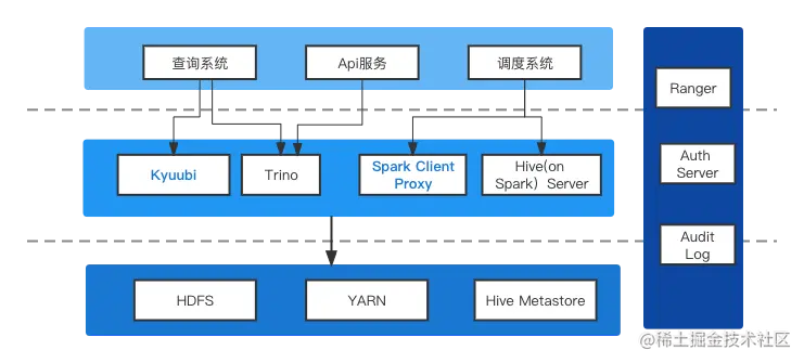 在Hive里面,我们继承了PasswdAuthenticationProvider实现了自定义的用户认证,通过集成Ranger实现了权限管控,而Spark开源版并没有完整的解决方案。官方的Spark Thrift Server在资源隔离和权限管控上有很大的不足,我们引入了Apache Kyuubi。Kyuubi也有类似PasswdAuthenticationProvider的接口,可以来实现用户认证。对于权限管控,一般的方案是使用Submarine。但是Submarine最新版本已经将这一模块去掉,而最近一个支持Ranger的0.6.0版本只支持Spark 3.0。Spark集成Ranger的要先解析SQL取得相关的表和字段,以判断当前用户是否有权限读写,而Spark 3.0到Spark 3.2.1的解析SQL做了很多修改,所以我们修改了相关的代码来适配Spark 3.2.1。同时基于Apache Kyuubi的Event体系,完成了Spark的审计功能。