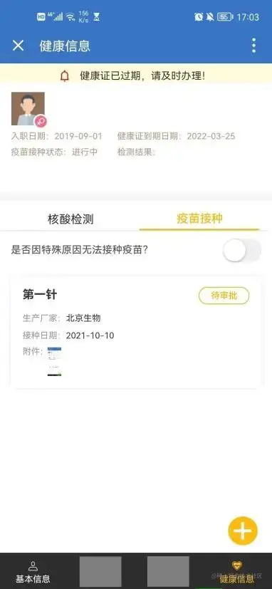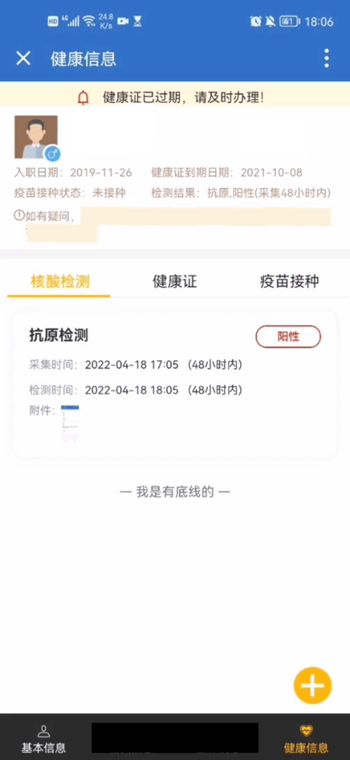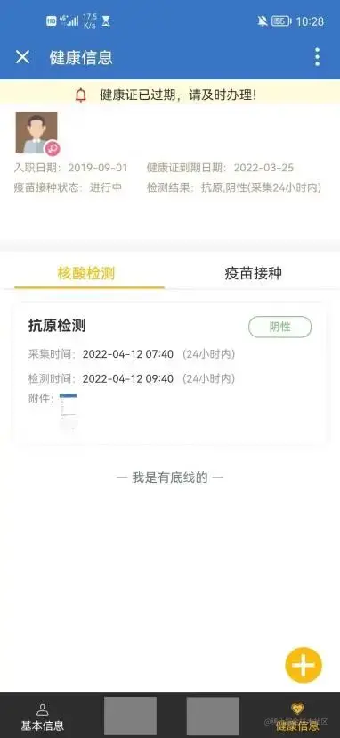 - 当用户需新增核酸信息时,点击右下角“+”,默认出现一张卡片,即可填写核酸检测记录;