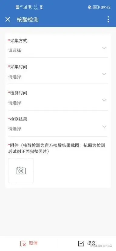 - 核酸录入详情页面共有五个字段:采集方式、采集时间、检测时间、检测结果、附件。