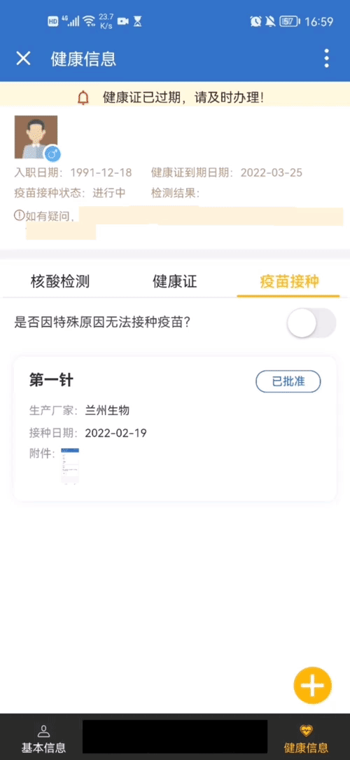 这两个应用可及时、高效、低成本实现了员工自助录入、更新个人健康信息,为企业节约了大量的人力资源成本。以下对“疫苗信息”和“核酸信息”的录入功能进行简单介绍。