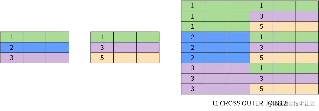 交叉连接也称为笛卡尔积(Cartesian Product)。两个表的交叉连接相当于一个表的所有行和另一个表的所有行两两组合,结果的数量为两个表的行数相乘。交叉连接的原理如下图所示: