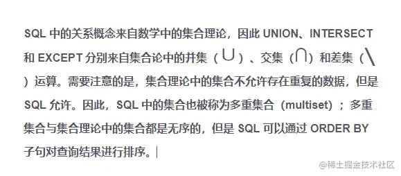 SQL 面向集合特性最明显的体现就是 UNION(并集运算)、INTERSECT(交集运算)和 EXCEPT/MINUS(差集运算)。