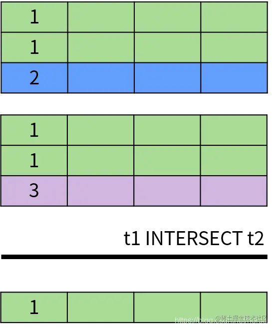 INTERSECT 操作符用于返回两个集合中的共同部分,即同时出现在第一个查询结果和第二个查询结果中的数据,并且排除了结果中的重复数据。INTERSECT 运算的示意图如下: