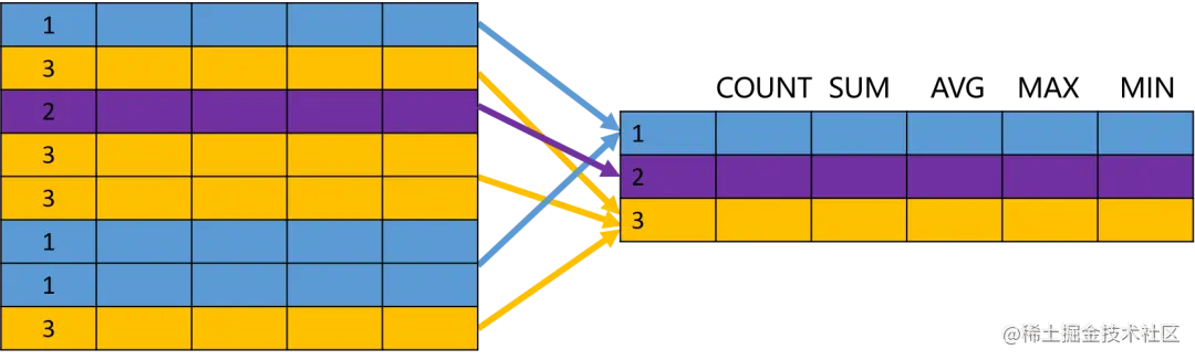 所以说,GROUP BY 改变了集合元素(数据行)的结构,创建了一个全新的关系。分组操作的示意图如下: