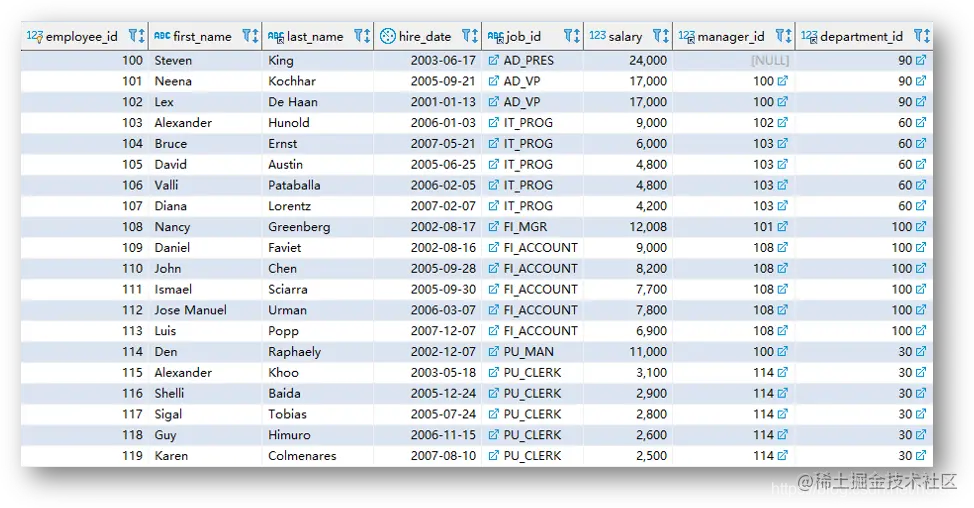 它的作用就是从 employees 表中查询员工信息。显然,我们都知道 FROM 之后是一个表(关系、集合)。不仅如此,整个查询语句的结果也是一个表。所以,我们可以将上面的查询作为表使用: