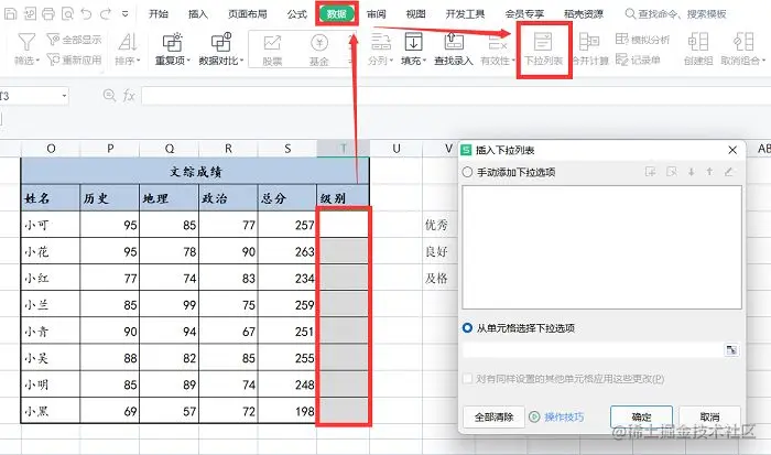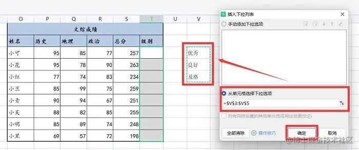 第三步: 将【从单元格选择下拉选项】中拉取第一步所列出的标准,然后点击【确定】。