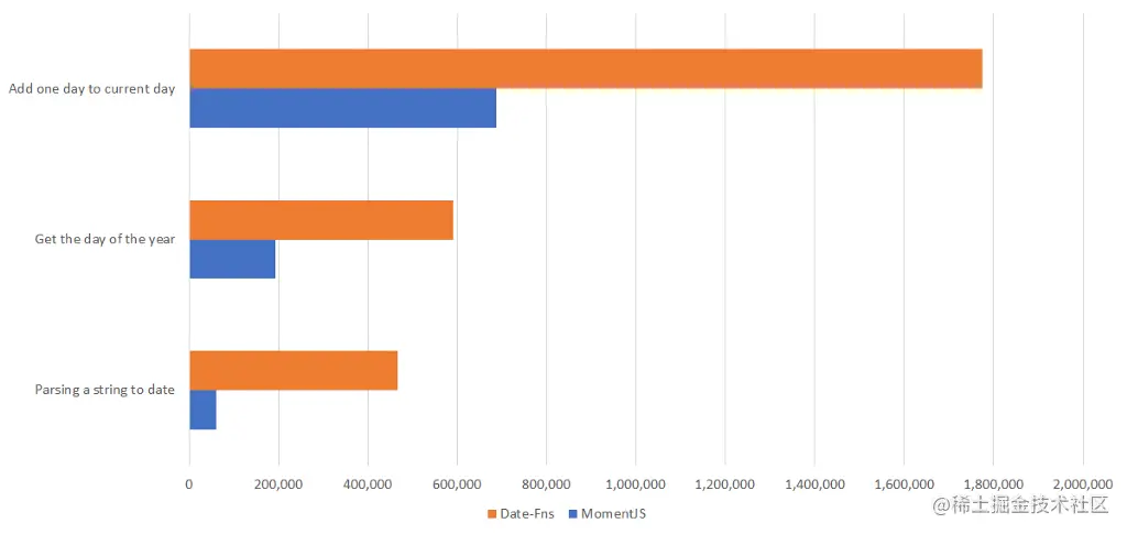 如果我们考虑性能,MomentJS由于其复杂的API和包的大小而有明显的性能问题。