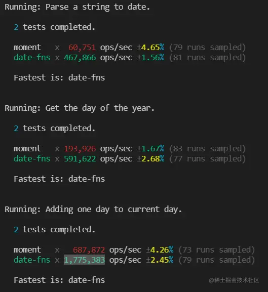 正如你所看到的,Date-fns在每秒执行的操作和规模方面在所有3个操作中都遥遥领先,简单的API是背后的主要原因。