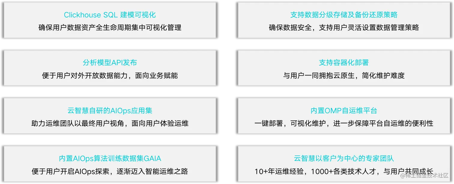 该方案主要包含以下八大优势,优势大部分都是云智慧独有的能力,这些能力在很多项目里都为企业带来了较大的运维能力提升。