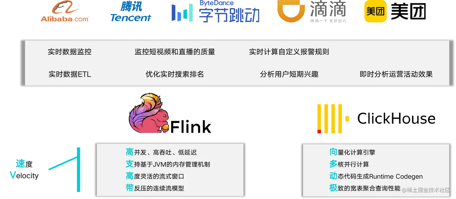 采用以上两个引擎,主要是因为在数据查询和计算方面的速度都有非常优秀的表现,均采用了大量的技术来优化相关方面的能力。简单举几个例子,flink本身架构设计就是为了实现数据计算的高并发、高吞吐和低延迟,flink自身基于jvm实现了自己的内存管理机制,在内存利用和垃圾回收方面都进行了针对性的优化,同时flink支持多种流式窗口来适应不同类型的流式数据处理,并且flink天生支持有一定流控能力的数据计算模型。而clickhouse的执行器支持向量化计算模式,同时支持多核并行计算模式。而且clickhouse在生成机器码的过程中采用动态代码生成Rntime Codegen技术,结合clickhouse 灵活多样的表引擎,使clickhouse具备目前业内最强的单表数据聚合查询性能。