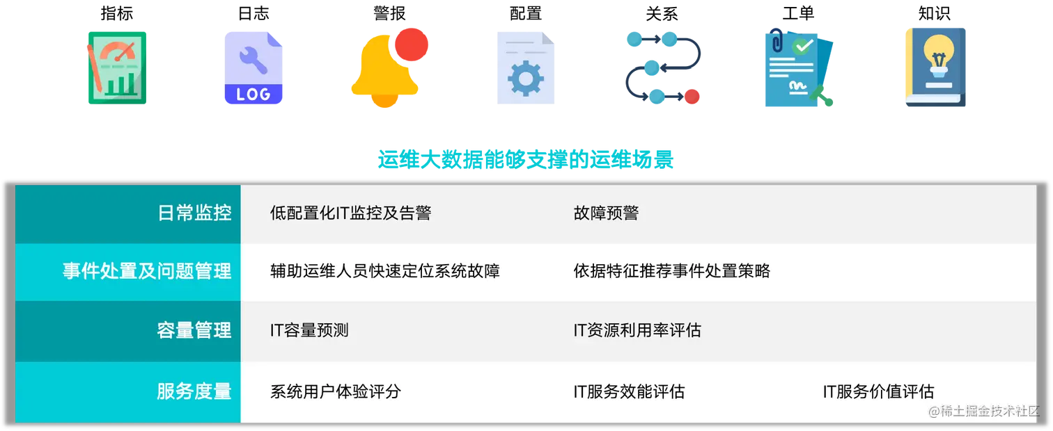 - 服务度量:通过系统运行的指标警报等数据来生成系统的用户体验得分,同时可以根据工单数据来统计运维团队的服务效能,更可以结合这两类数据来进行IT服务的价值评估。