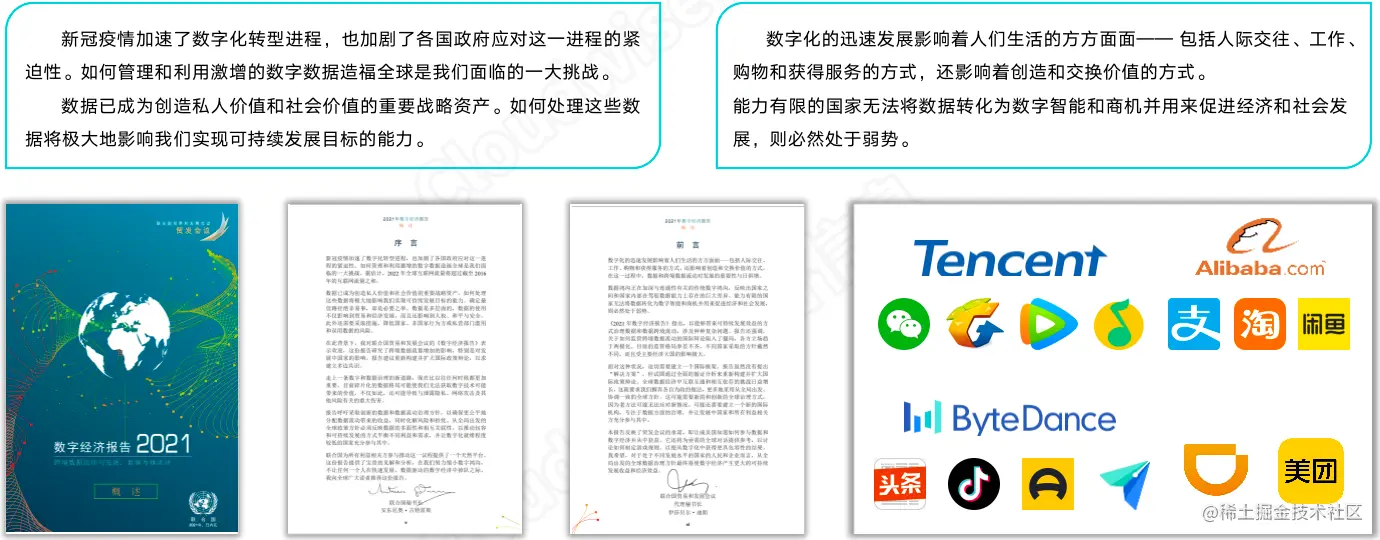 近年来,随着IT互联网的迅速发展,数字经济与数字生活对人们日常生活的影响也逐渐加深。如下图右下角所示,部分APP已经改变了人们的衣食住行。此外,新冠疫情在全球的爆发也使得全球数字化发展的速度得到了进一步提升。在面对疫情不确定性挑战中,各个行业都意识到了数字化转型对企业的重要性。 下图2021年联合国发布的全球数字经济报告中更是深刻地指出了数字经济以及数字资产对各个国家的影响。