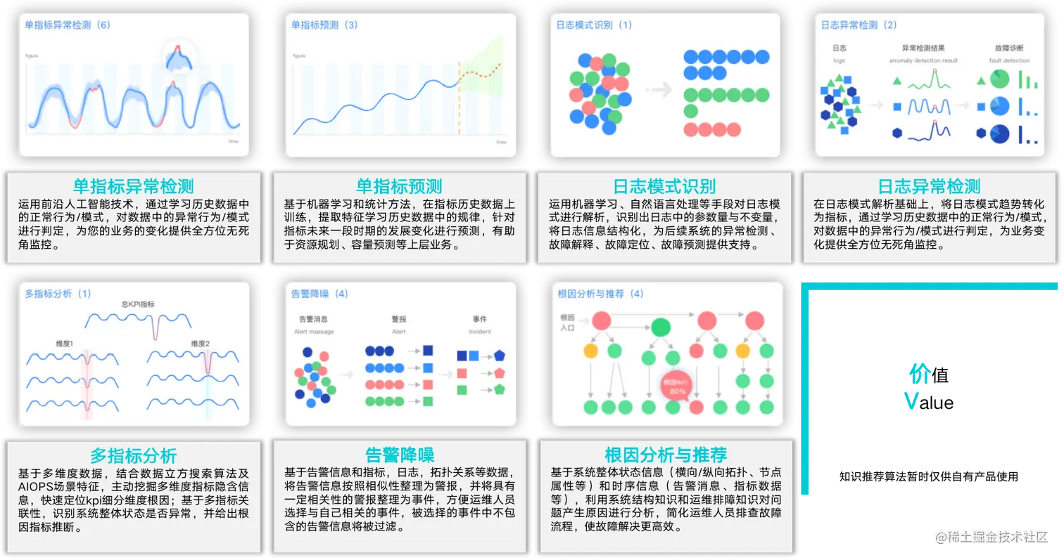 - 7大类内置算法,展现数据价值,轻松提高运维效能 此外,在数据应用层面,该方案更是内置了7大类AIOps算法,通过这些算法能够充分展现运维数据价值,直接实现具体的智能运维场景,帮助企业大大地提高了运维效能。