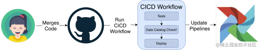 CICD管道是代表你的数据的形状和语义改变的时刻的控制点。这是注入你的数据目录的正确位置,因为它是_在_实际数据变化_之前_。下图提供了一个CICD流程的简单例子,该流程在部署前用数据目录验证元数据的变化。