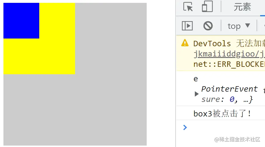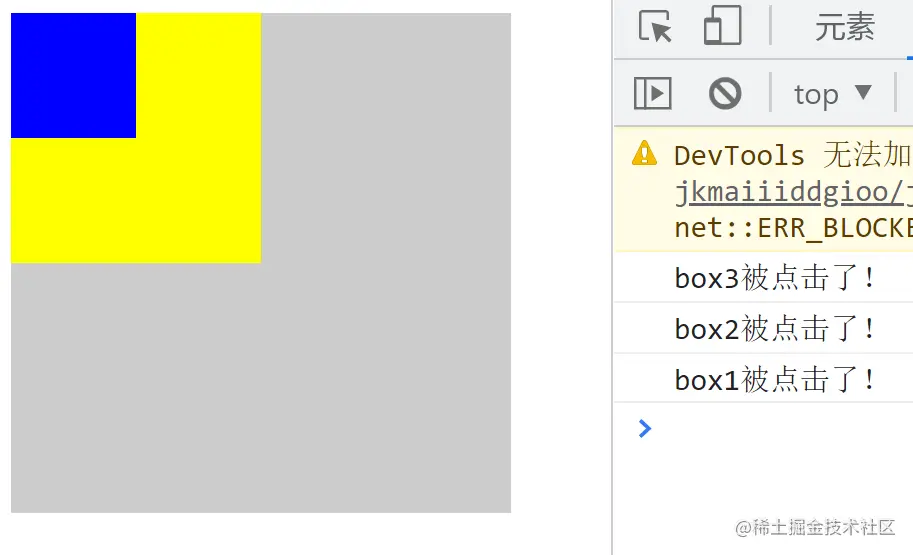 我们更改 box3de 事件处理函数,函数会默认接收一个事件参数,可以调用 stopPropagation()阻止冒泡。