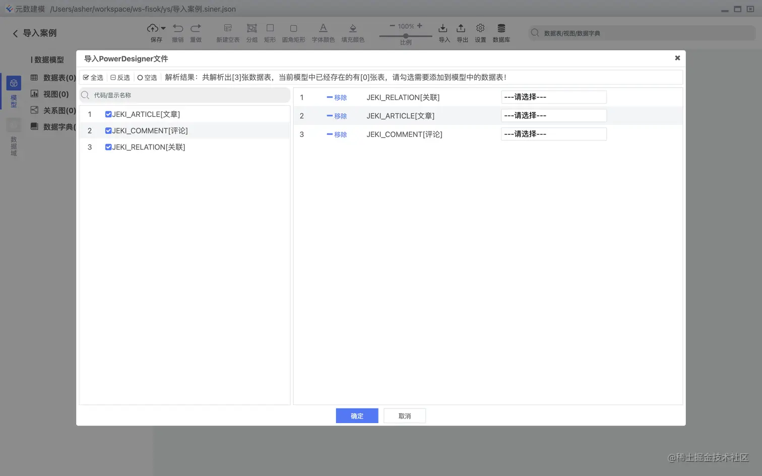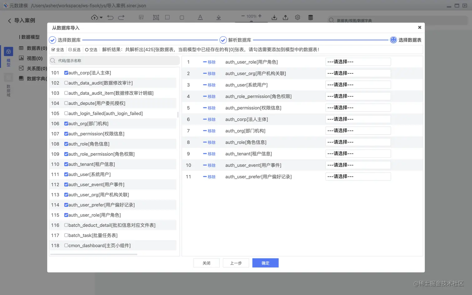 支持PDMan的导入,支持数据表,关系图,数据域的高度还原。 导入列表选择,如下图: