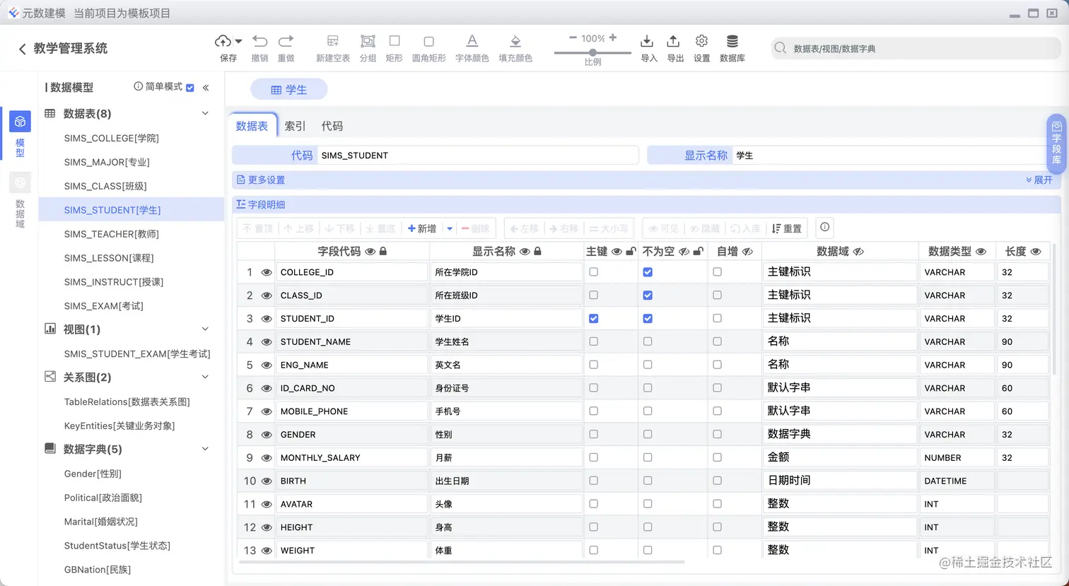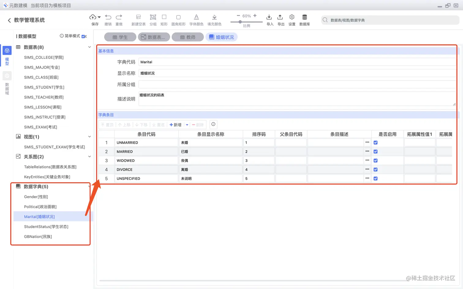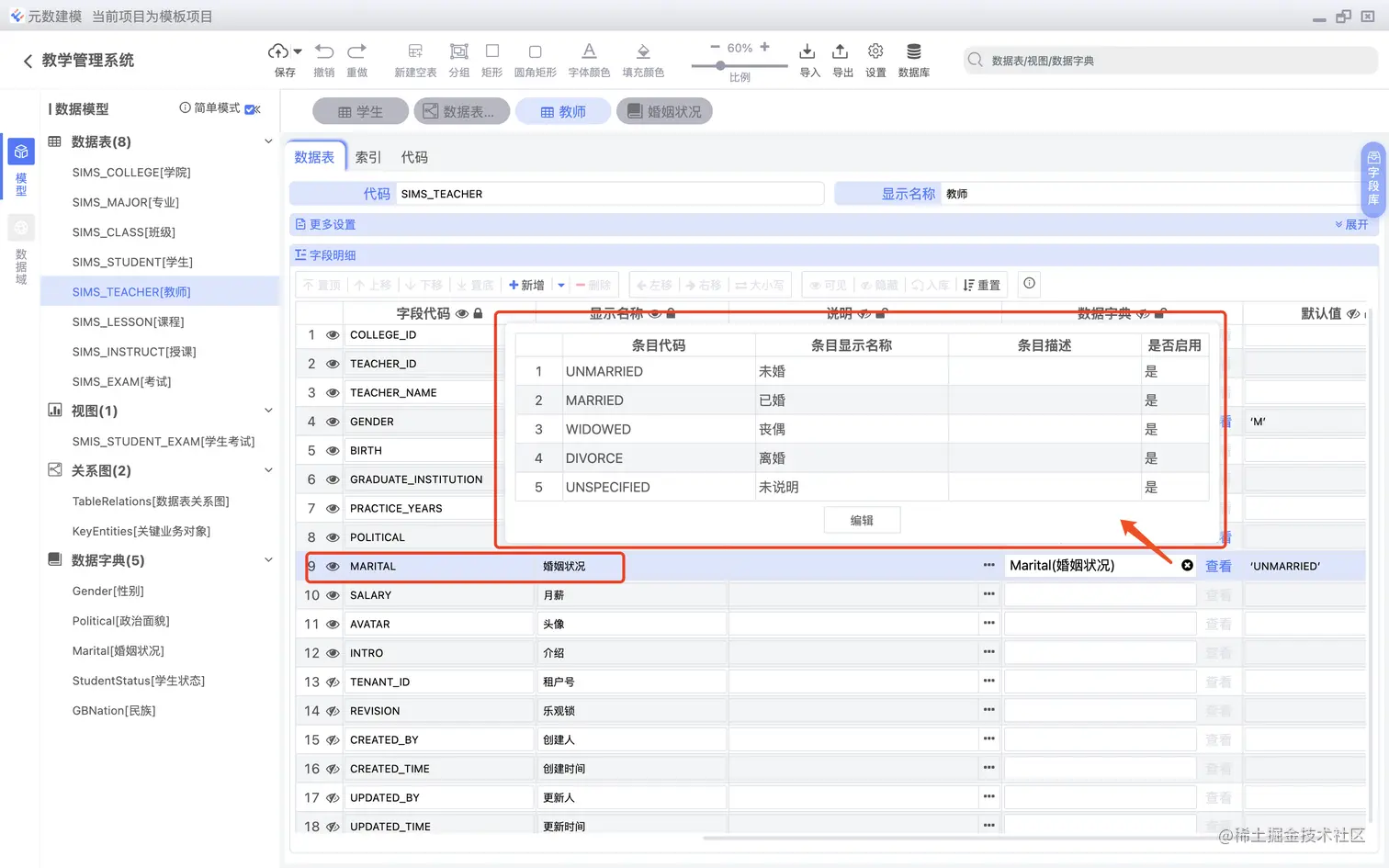 数据表字段可以直接关联数据字典,如下图所示: