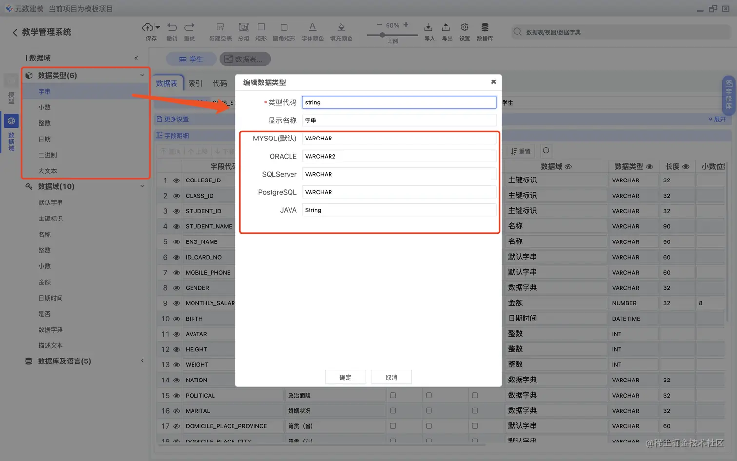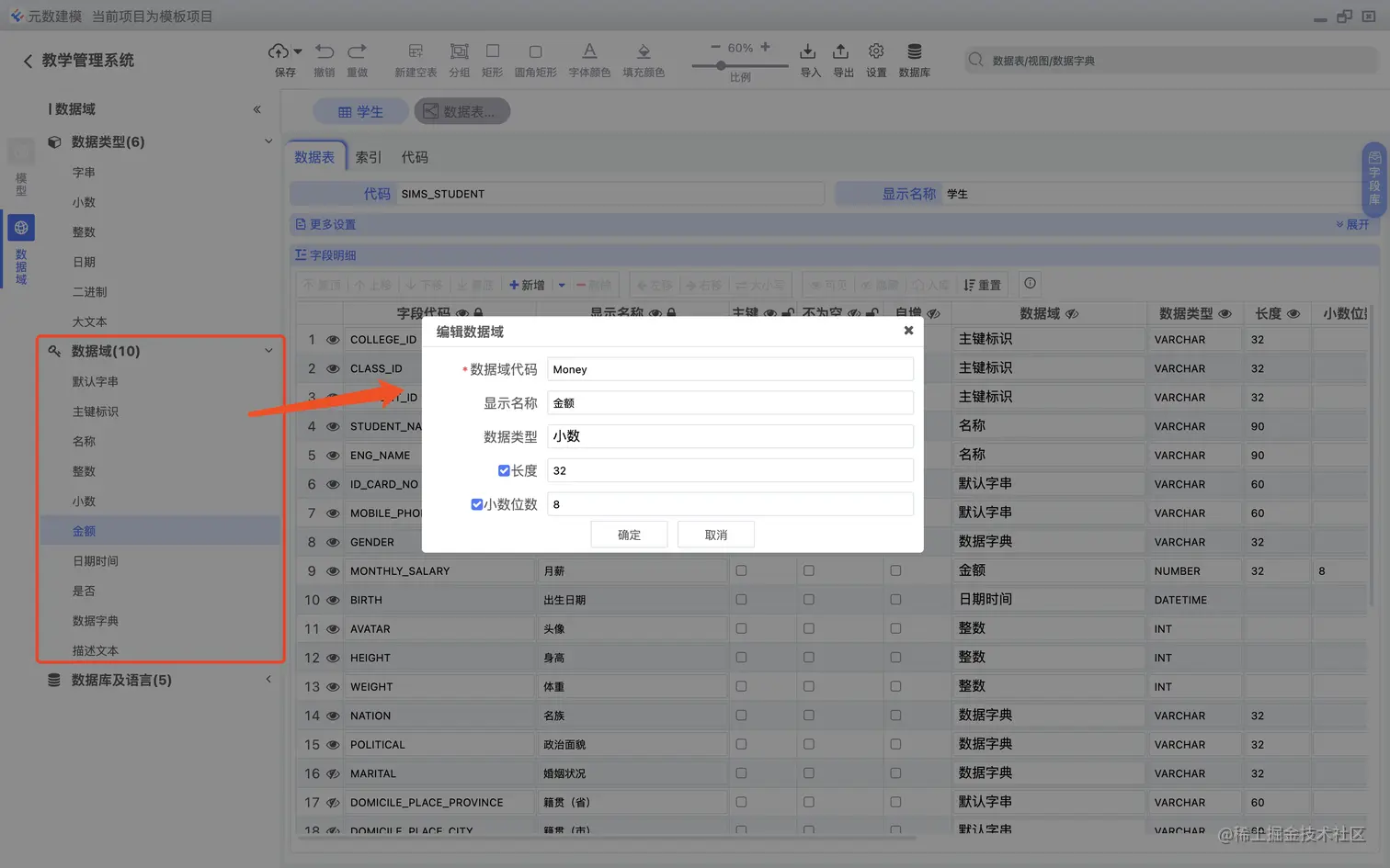 数据域,用于设置同一类具有特定业务含义的数据类型,其实这个是很重要的,我们在做数仓建模的过程中是需要统一字段命名和字段类型,如下图: