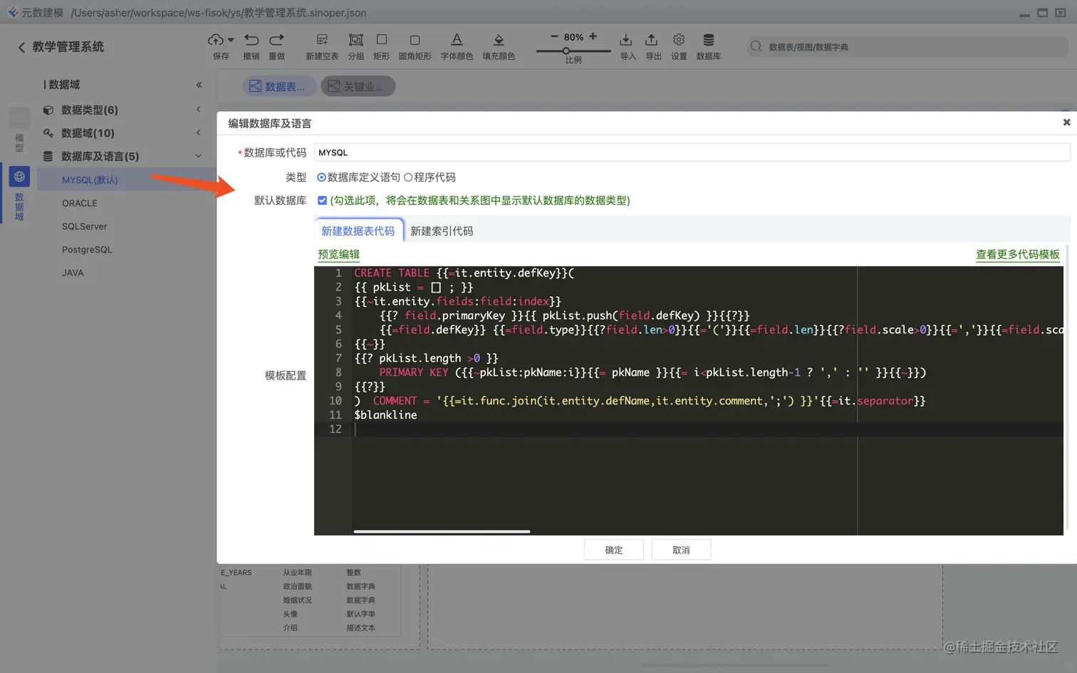 通过代码模板引擎,实现可扩展的数据库方言支持,如下图: