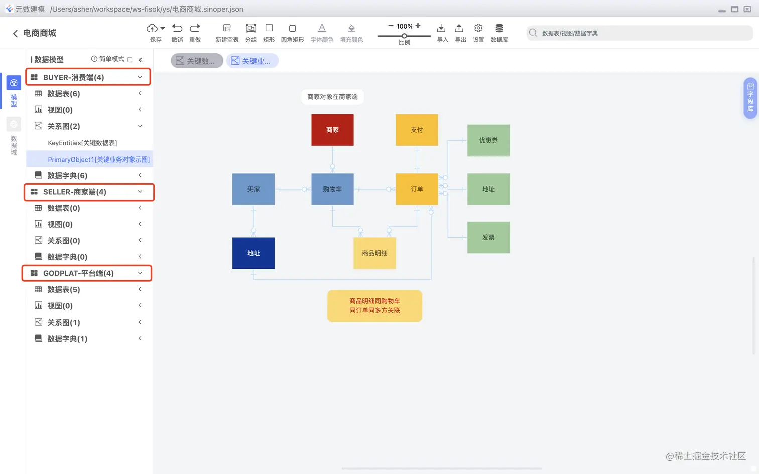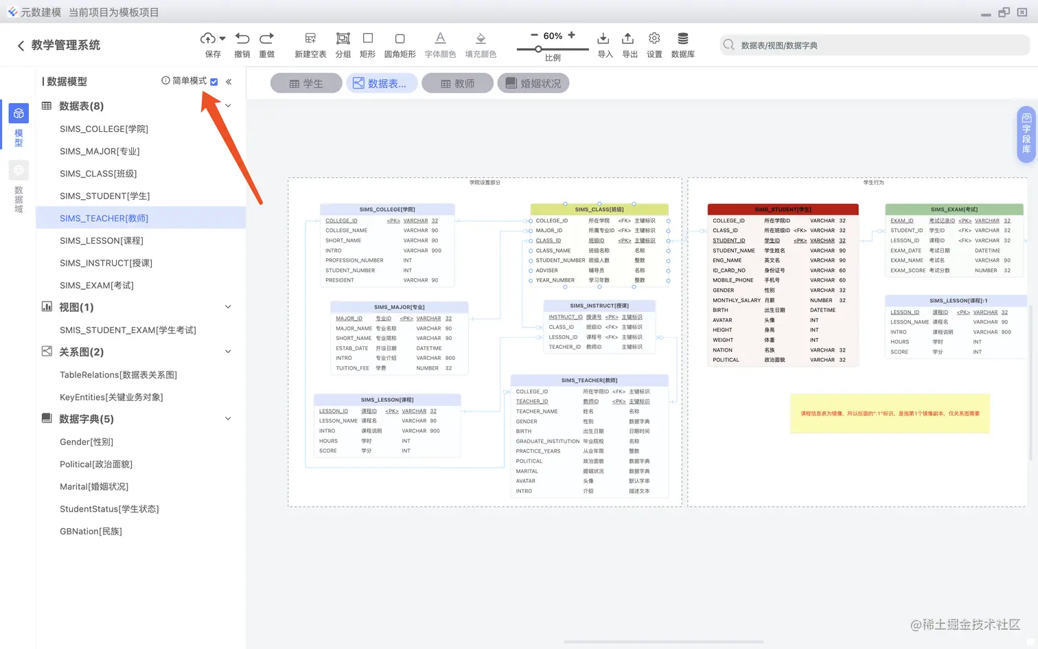 简单项目,不需要分模块,直接分为数据表,视图,关系图,数据字典即可,复杂项目需要折分为一个一个独立的模块,系统对这两种形式均给予支持。 简单模式,如下图: