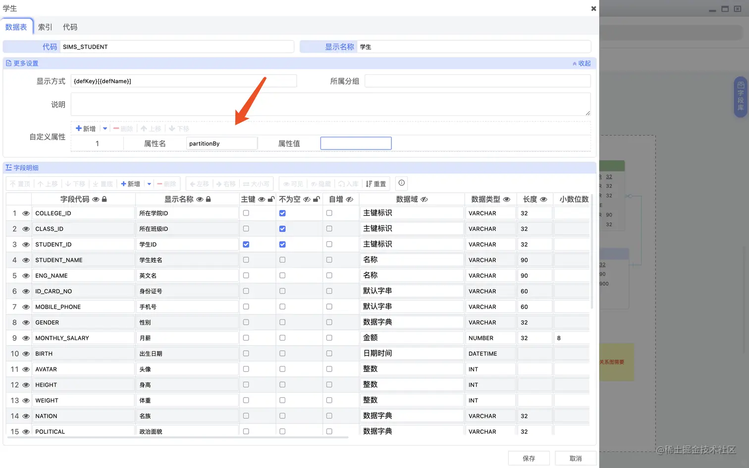提供简洁直观的数据表以及字段管理及操作,左侧列表支持拖动排序,数据表更多设置支持增加表备注,扩展属性列表,例如提供对Hive的支持,如下图: