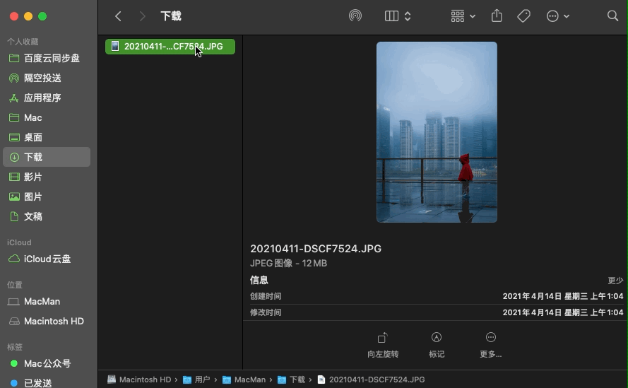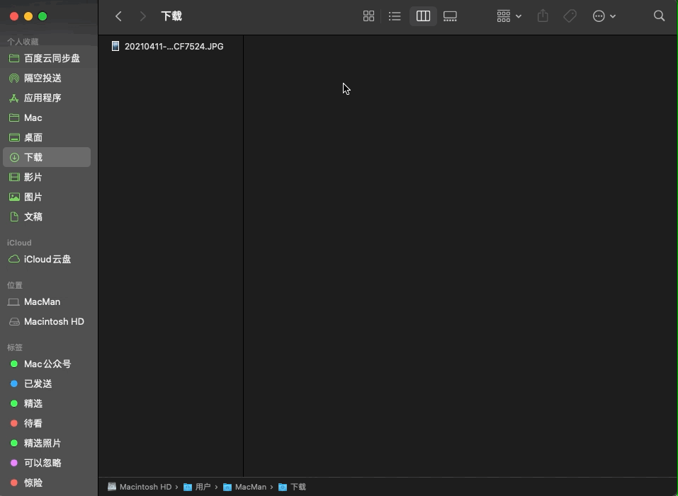 二、将照片拖入访达左上角边栏的「隔空投送」里面的设备中