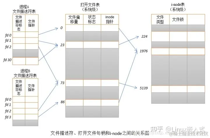 文件描述符表、系统打开文件表、inode之间的关系如图所示: