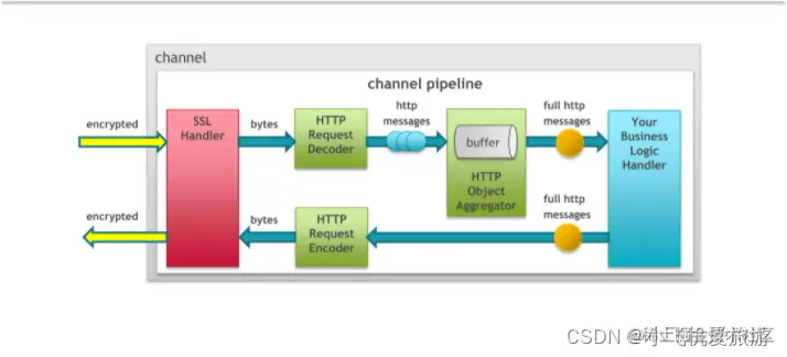 1)一个加密数据传输过来,首先经过我们的handler去找到对应的channel去处理,然后将报文交给解密的handler去解析报文,之后将数据传递给业务端,业务端处理之后,再次将响应报文encode之后传递出去(代码:Netty介绍及实战)。