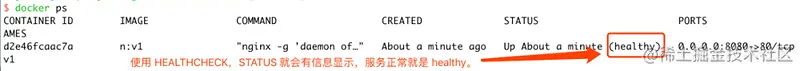 启动后,HEALTHCHECK 就会5秒钟访问一次 Nginx 服务,来确保容器运行的状态。\