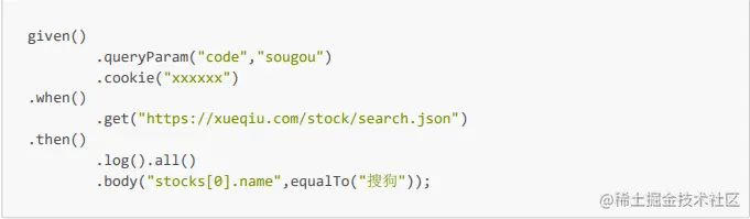 答:given用于放置需要的参数,比如上面例子中,我将访问参数:code和cookie放到了given里;when用于填 写要访问的url;then进行断言,来来判断结果是否正确。
