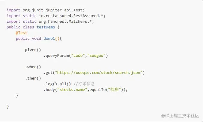 现在,我们使用 Rest-Assured 来编写一个简单的测试程序调用相同的Get请求: