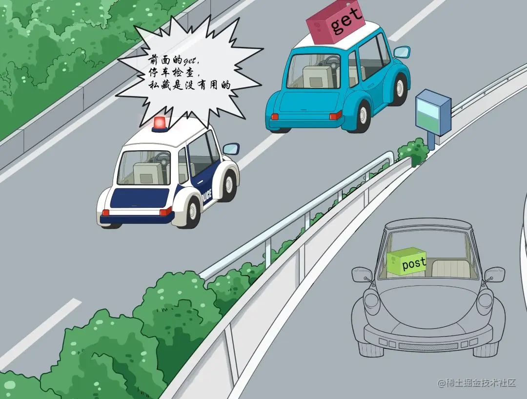 为了避免这种情况发生,交通规则HTTP诞生了。HTTP给汽车运输设定了好几个服务类别,有GET, POST, PUT, DELETE等等,HTTP规定,当执行GET请求的时候,要给汽车贴上GET的标签(设置method为GET),而且要求 把传送的数据放在车顶上(url中)以方便记录。如果是POST请求,就要在车上贴上POST的标签,并把货物放 在车厢里。当然,你也可以在GET的时候往车厢内偷偷藏点货物,但是这是很不光彩;也可以在POST的时候在车顶上也放一些数据,让人觉得傻乎乎的。HTTP只是个行为准则,而TCP才是GET和POST怎么实现的基本。