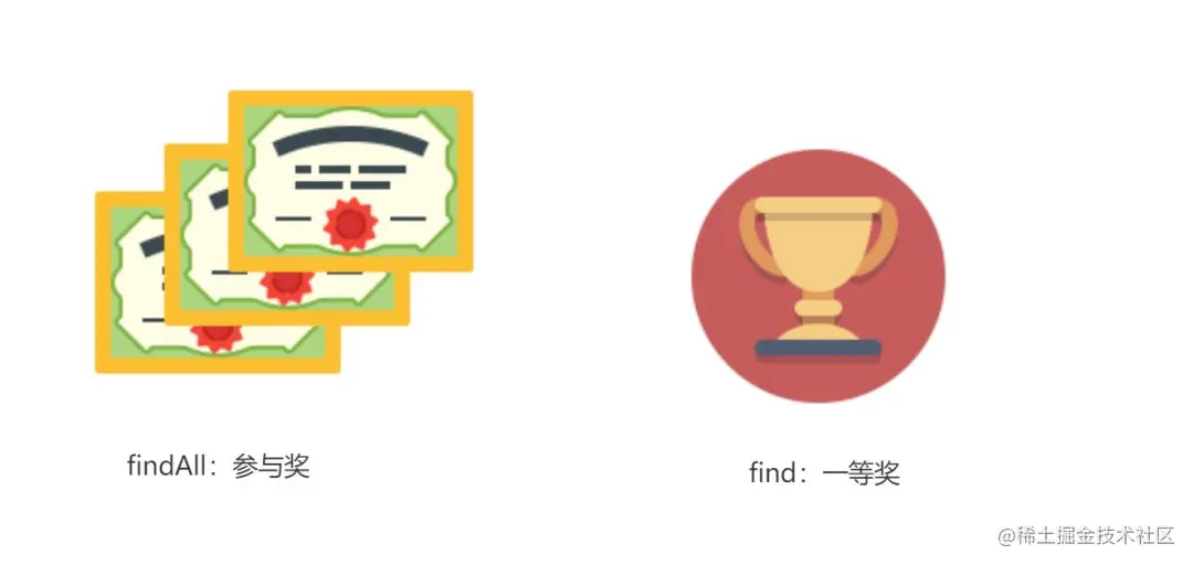 对的,这时候应该使用findAll,可以粗鲁的认为多个find的叠加。findAll可以筛选出一批符合要求的数据,而 find只能筛选出一个符合要求的数据,这就像是我们只能挑出一个人领取一等奖,但有很多人可以拿参与奖, 两个方法都有自己的用武之地。