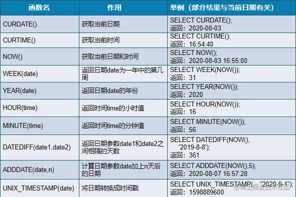 CURDATE() 获取当前日期 SELECT CURDATE();返回:2016-08-08 CURTIME() 获取当前时间 SELECT CURTIME(); 返回:19:19:26 NOW() 获取当前日期和时间 SELECT NOW();返回:2016-08-08 19:19:26 WEEK(date) 返回日期date为一年中的第几周 SELECT WEEK(NOW()); YEAR(date) 返回日期date的年份 SELECT YEAR(NOW()); HOUR(time) 返回时间time的小时值 SELECT HOUR(NOW()); DATEDIFF(date1,date2) 返回日期参数date1和date2之间相隔的天数 SELECT DATEDIFF(NOW(),'2008-8-8'); 返回:2881