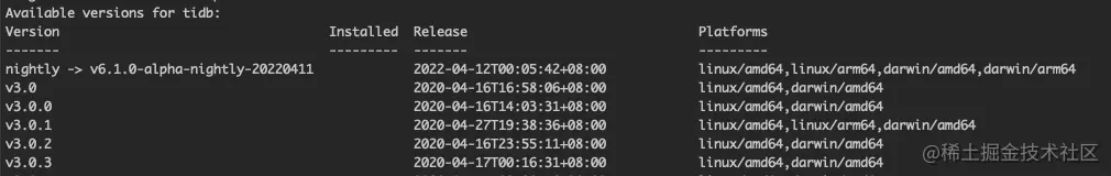 如果没指定各个组件的版本,会使用最新的版本,如tidb,tikv等的最新版本是v6.0.0,则相当于运行tiup playground:v1.19.3 v6.0.0