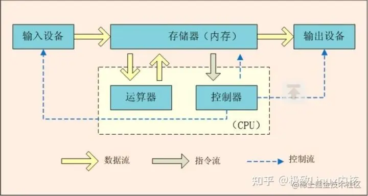 根据冯诺伊曼提出的计算机体系架构,一台计算机主要分为五个部分:控制器、运算器、存储器、输入设备、输出设备